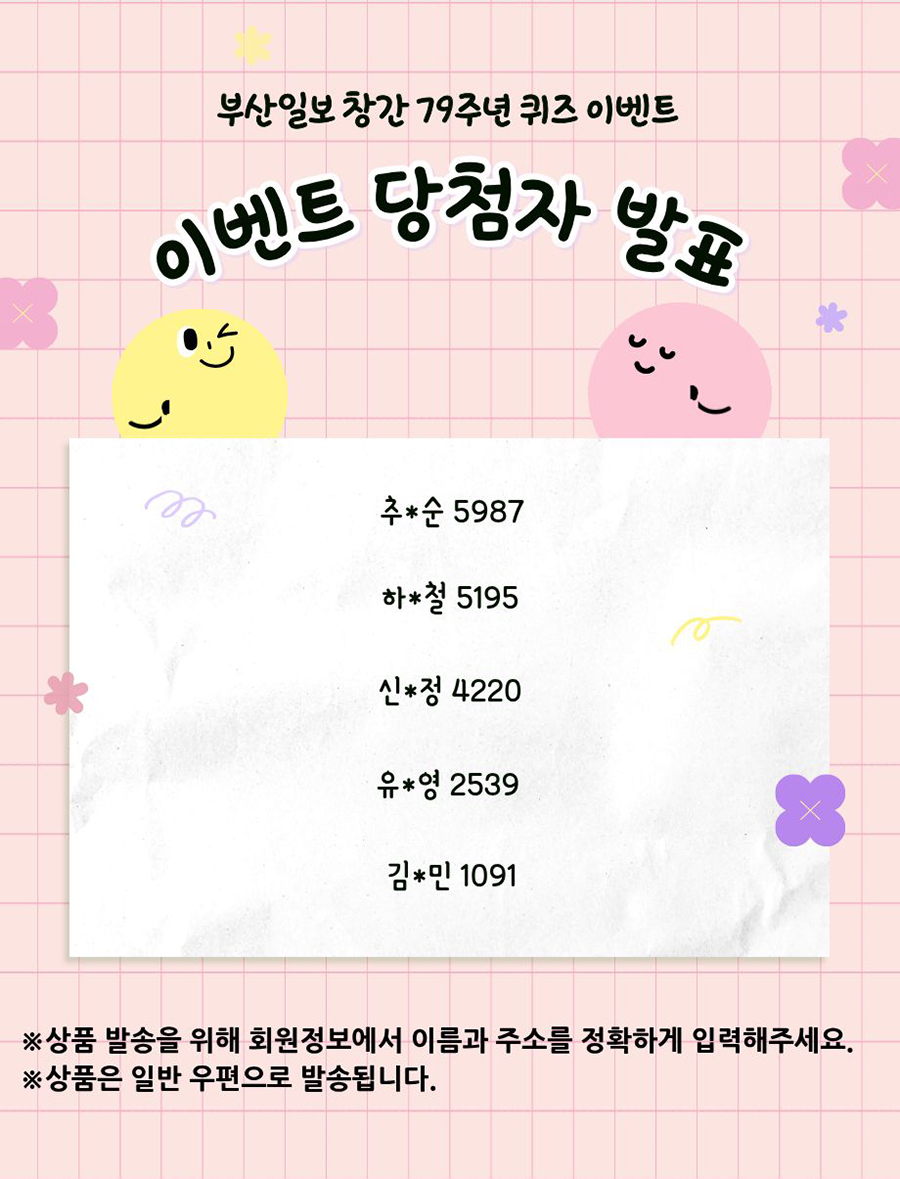 [해피존플러스] 부산일보 창간 79주년 퀴즈 이벤트 당첨자 안내
