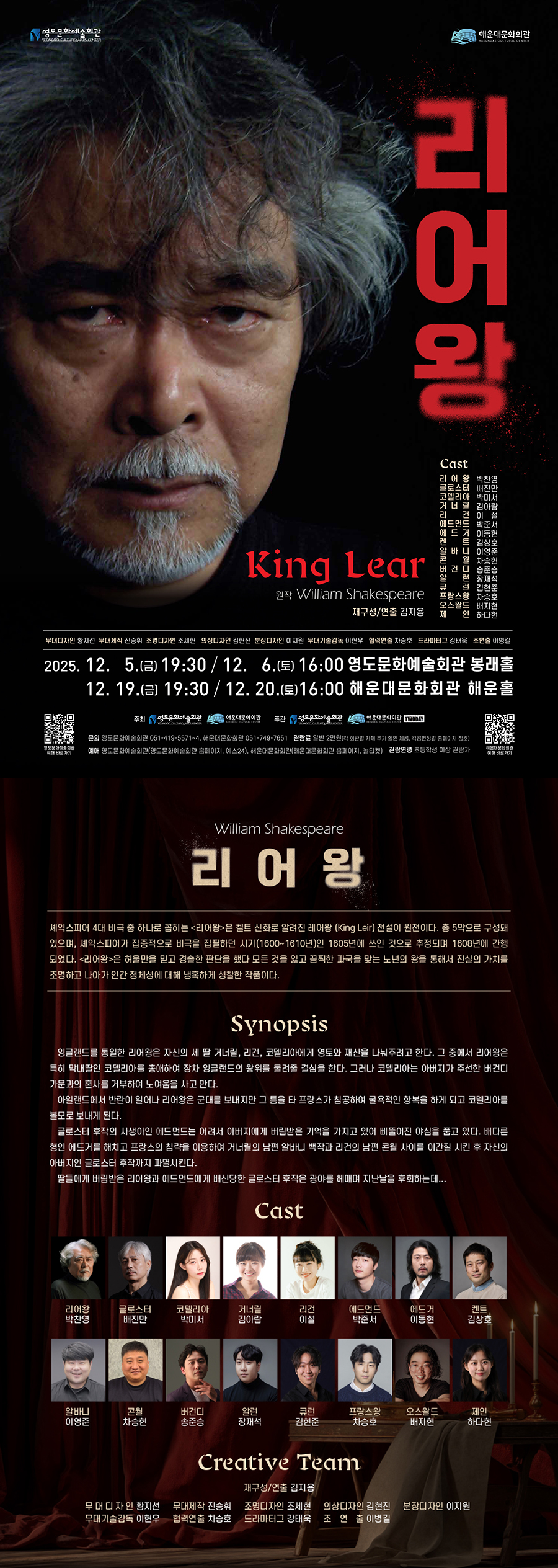 리어왕!!셰익스피어 작품 기대됩니다~~~해운대 문화회관이라니 집앞이라 더더욱 좋은 기회네요♡
