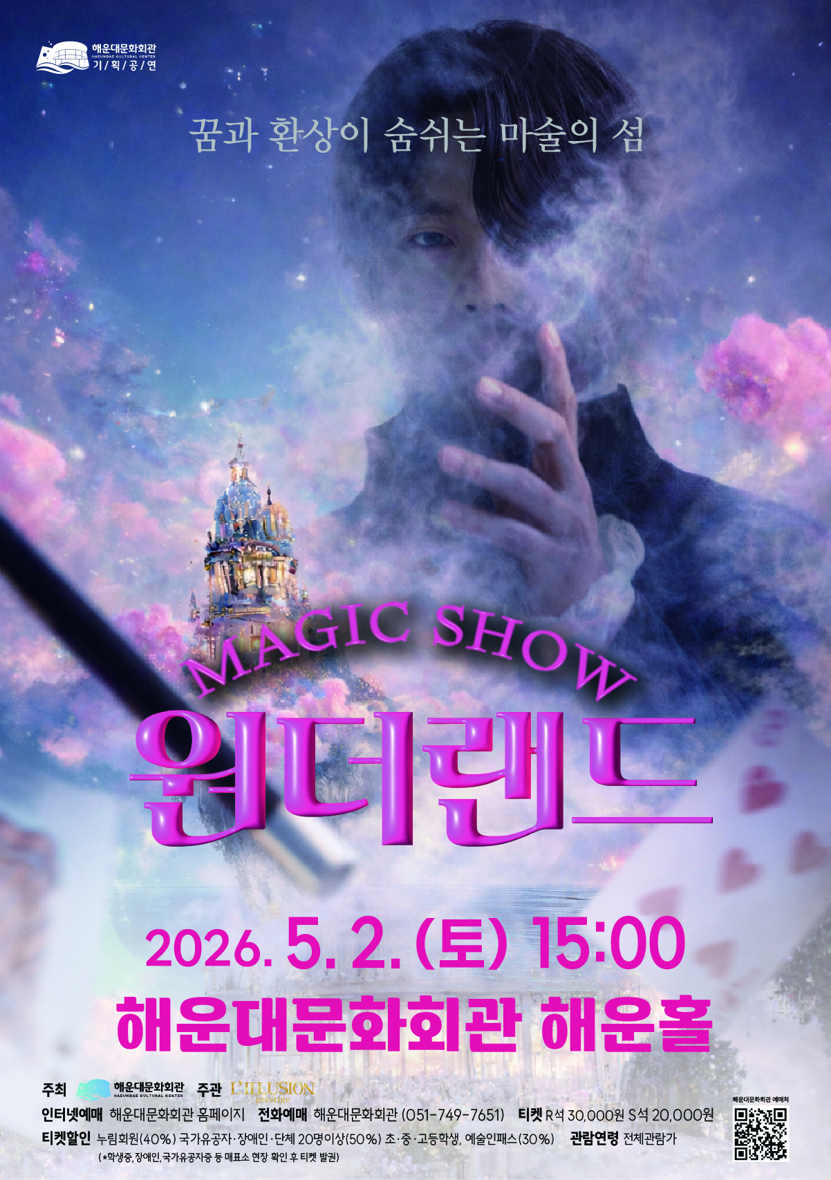 대형마술부터 다이나믹한 매직 퍼포먼스, 샌드아트, 벌룬쇼까지 온 가족을 위한 종합선물세트 Magic Show '원더랜드'로 초대합니다! 공연이 기대되는 이유를 댓글로 달아주시면 추첨을 통해 관람권을 드립니다 :)